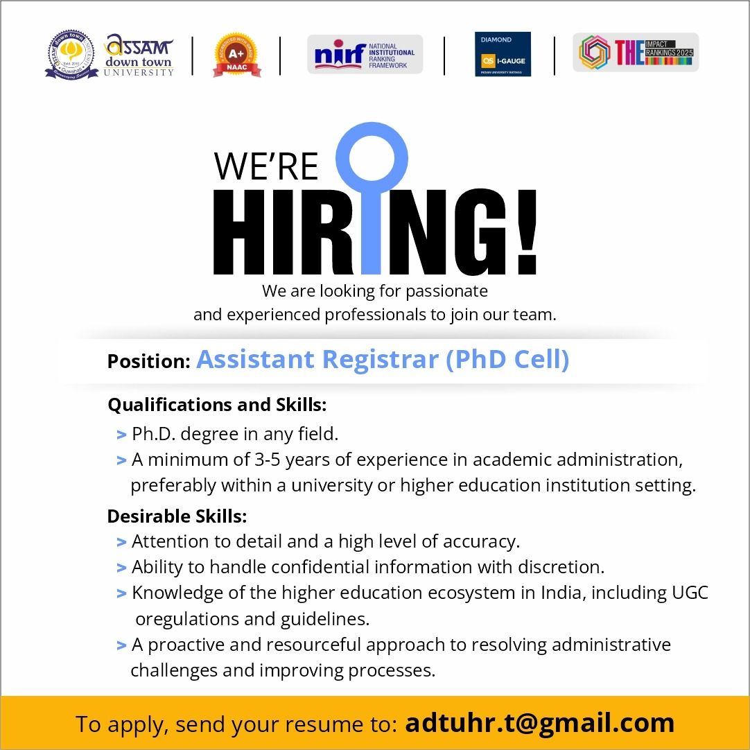 Assam down town University is looking for passionate and experienced professionals to join as Assistant Registrar (PhD Cell).