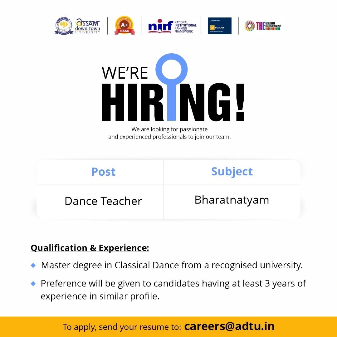 Assam down town University is looking for a passionate Dance Teacher for Bharatnatyam.