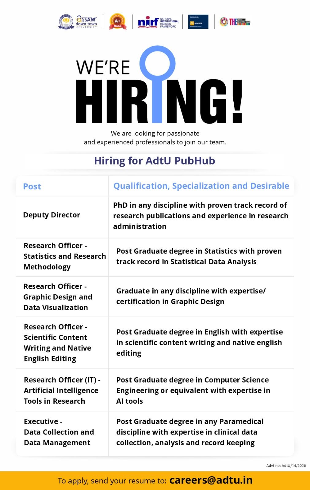 Apply Now: careers@adtu.in
