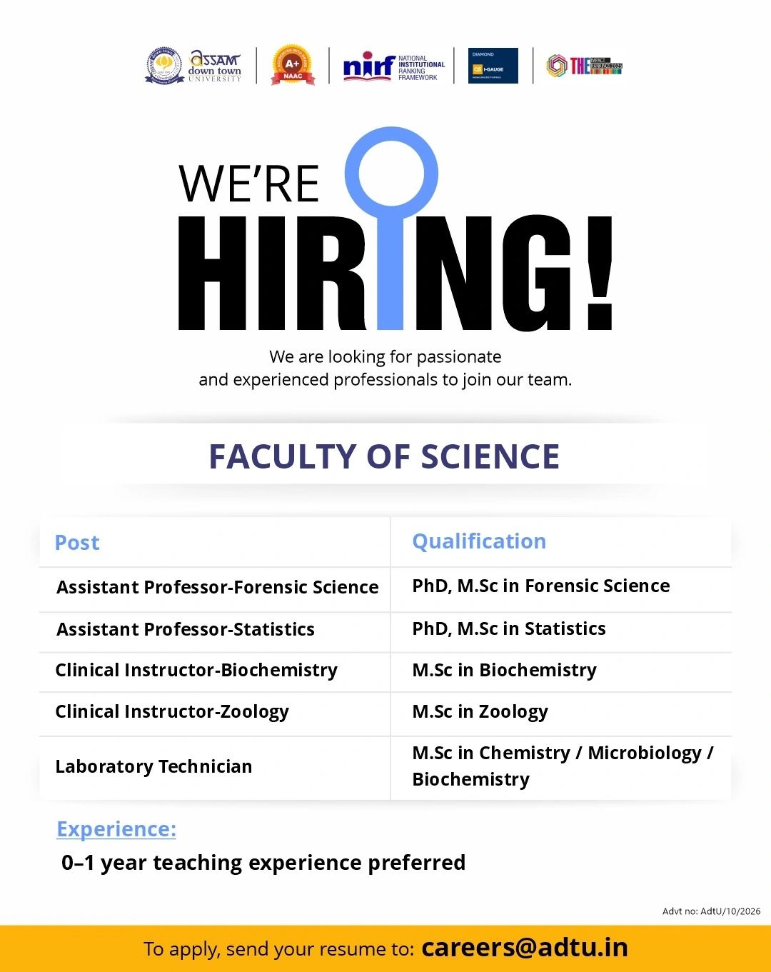 Assam down town University invites applications from qualified and dedicated academicians and professionals to join the Faculty of Science