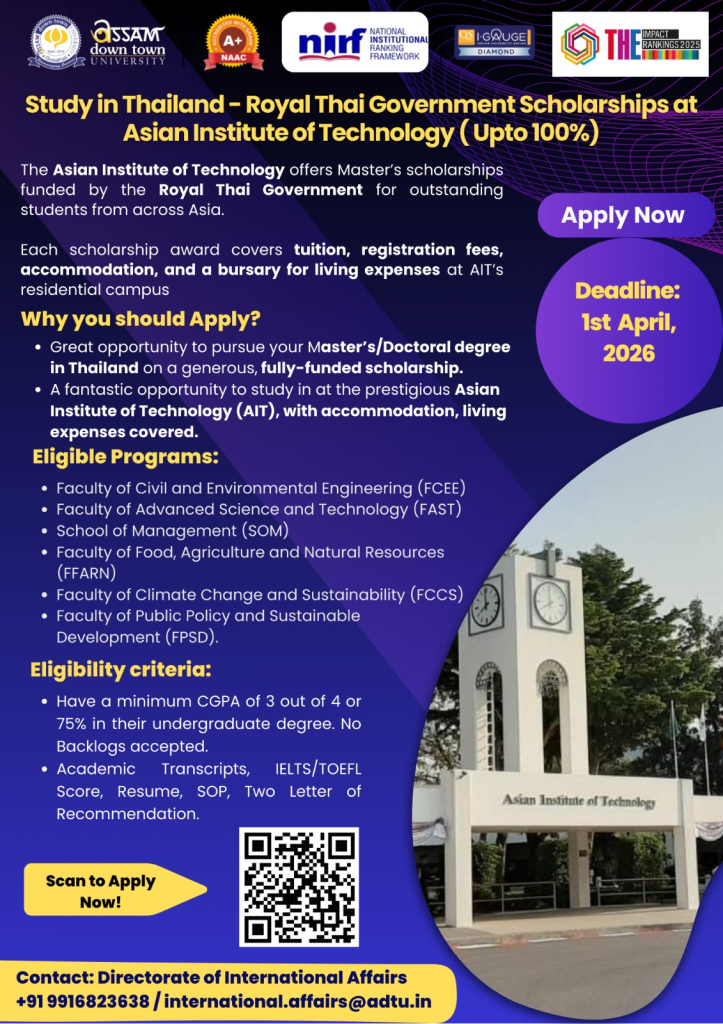 Study in Thailand - Royal Thai Government Scholarships at Asian Institute of Technology (Upto 100%) |