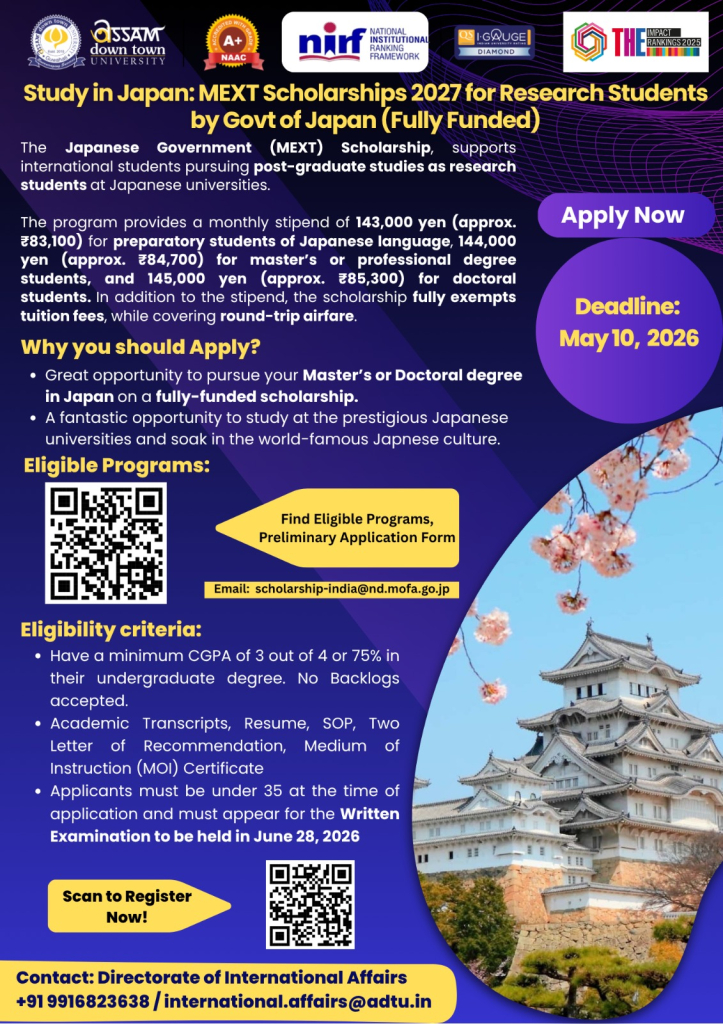 Study in Japan: MEXT Scholarships 2027 for Research Students by Govt of Japan (Fully Funded) |
