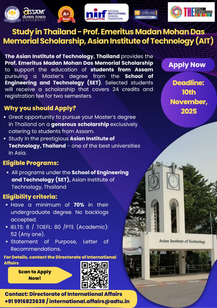 Study in Thailand - Prof. Emeritus Madan Mohan Das Memorial Scholarship, Asian Institute of Technology (AIT) |
