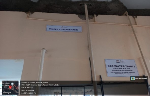 The rainwater harvesting system at Assam down town University facilities consists of multiple blocks with different tank capacities. Block A have tanks with a capacity of 40,000 litters, while Block B has a larger tank holding 150,000 liters. Blocks E and J feature tanks with a capacity of 40,000 liters each. These tanks collect rainwater from various surfaces and store it for non-potable uses within the university, reducing reliance on groundwater and municipal water supply. The system promotes water conservation, mitigates storm water runoff, and demonstrates the university's commitment to sustainability.
