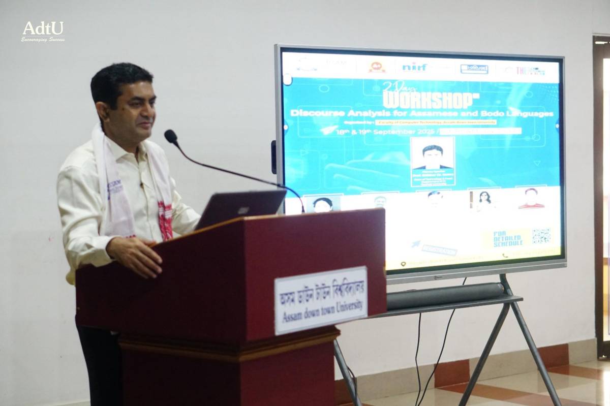 The Faculty of Computer Technology, Assam down town University (AdtU) successfully organized a 2-Day Workshop on Discourse Analysis for Assamese and Bodo Languages. The event was formally inaugurated with lamp lighting by the Chairperson, Resource Persons, and Patron. Convenor Dr. Dr Jumi Sarmah highlighted the significance of the workshop, marking it as the first of its kind in North-Eastern languages. Prof. shikhar kr. sarma (Dean of Technology & HOD, IT, GU) delivered the Plenary Talk, emphasizing the linguistic richness of Assamese and Bodo and the challenges of capturing discourse structures computationally. Prof. N.C. Talukdar (Vice Chancellor, AdtU) graced the occasion with the Keynote Address, appreciating the initiative.