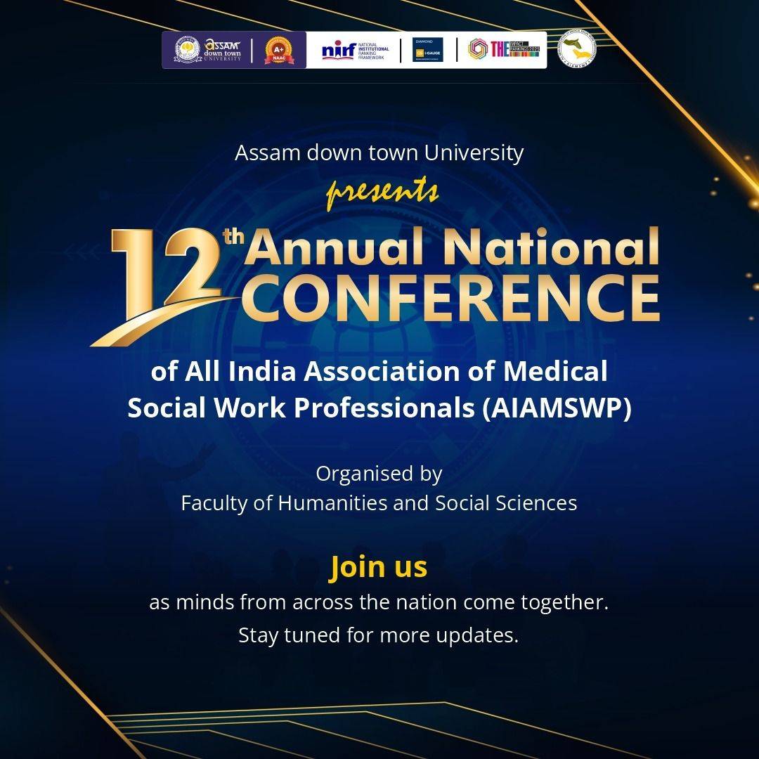 Assam down town University proudly presents the 12th Annual National Conference of the All India Association of Medical Social Work Professionals (AIAMSWP) , a national platform dedicated to care, compassion, and social commitment.