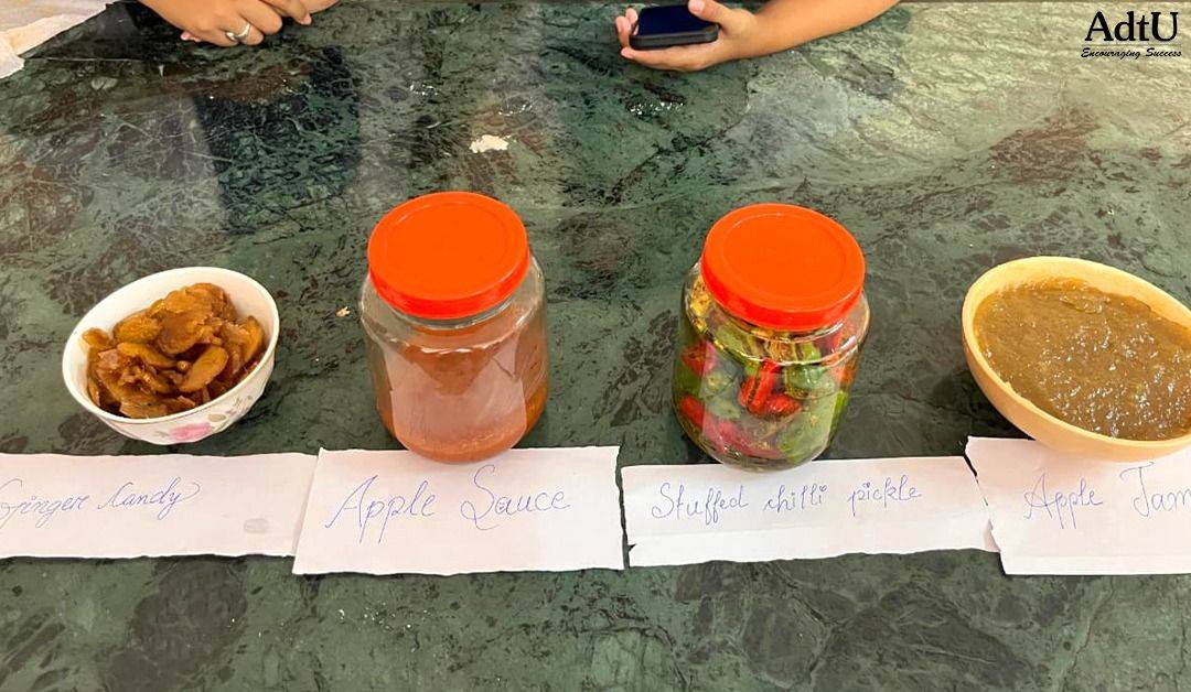 Under the guidance of Dr. Karishma Borah and Dr. N. Kapaini Basena, Assistant Professor, FnD 6th-semester B.Sc. (Hons) Agriculture students gained practical exposure to essential post-harvest techniques. During the session, students successfully prepared products such as apple jam, apple sauce, stuffed chilli pickle, and ginger candy, while learning the effective use of natural preservatives like sugar, salt, and oil.