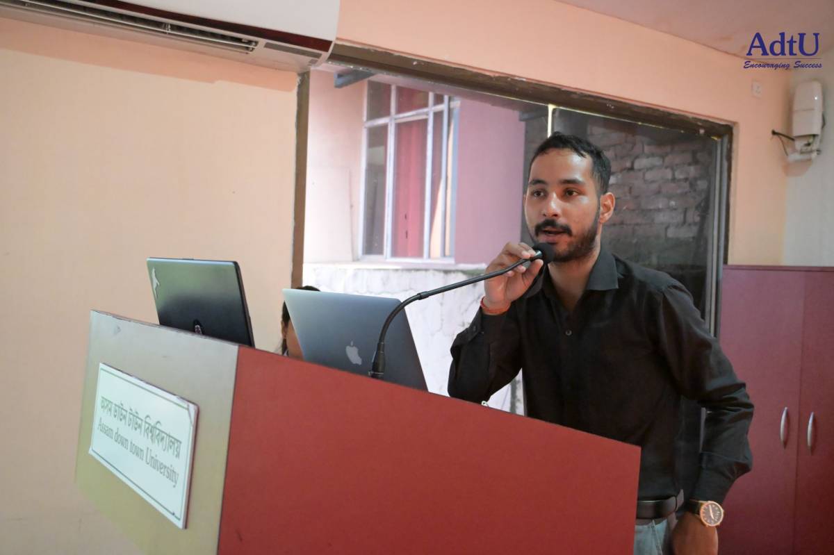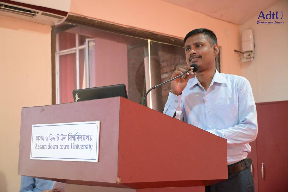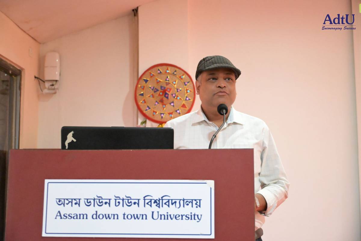 In his welcome address, Dr. Samannoy Baruah expressed his gratitude towards Mr. Dutta for sharing his journey and inspiring the students. Mr. Dutta began his talk by reflecting on his transition from being a student at Assam down town University to establishing himself in the professional world. He candidly spoke about his early struggles, uncertainties, and a failed project that, despite initial disappointment, became a turning point in his career.