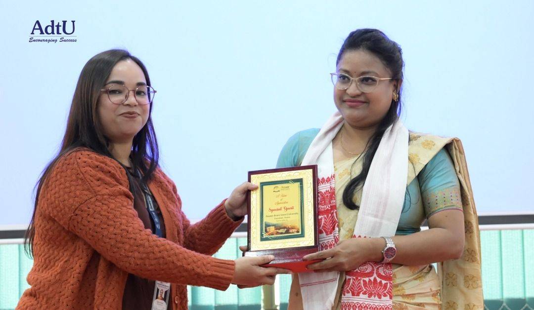 The program was graced by the presence of esteemed faculty members Dr. Partha Pratim Kalita, Assistant Professor, Dr. Nayan Talukdar, M Sc. Ph.D. Talukdar, Associate Director, Alumni Affairs, and Ms. Gouri Acharjee, Executive, Directorate of Alumni Affairs. The Guest of Honour, Dr. Lekhika Pathak, was formally felicitated with a traditional Fulaam Gamusa and a memento as a mark of respect and appreciation.