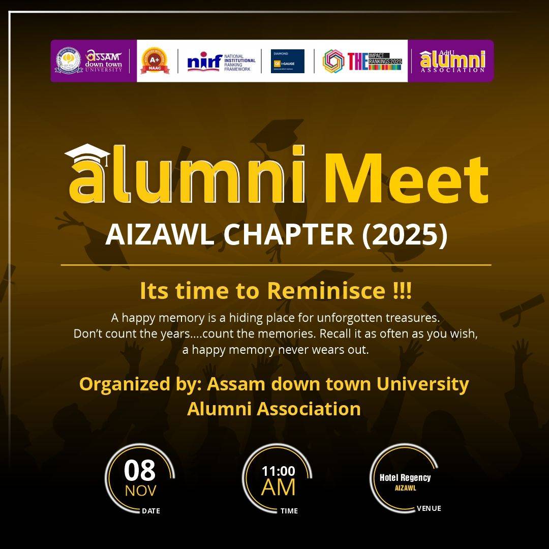 Assam down town University, through its Alumni Association, is delighted to host the Alumni Meet, Aizawl Chapter, a special gathering designed to rekindle bonds, celebrate shared memories, and honor the enduring connection between the university and its esteemed alumni.
