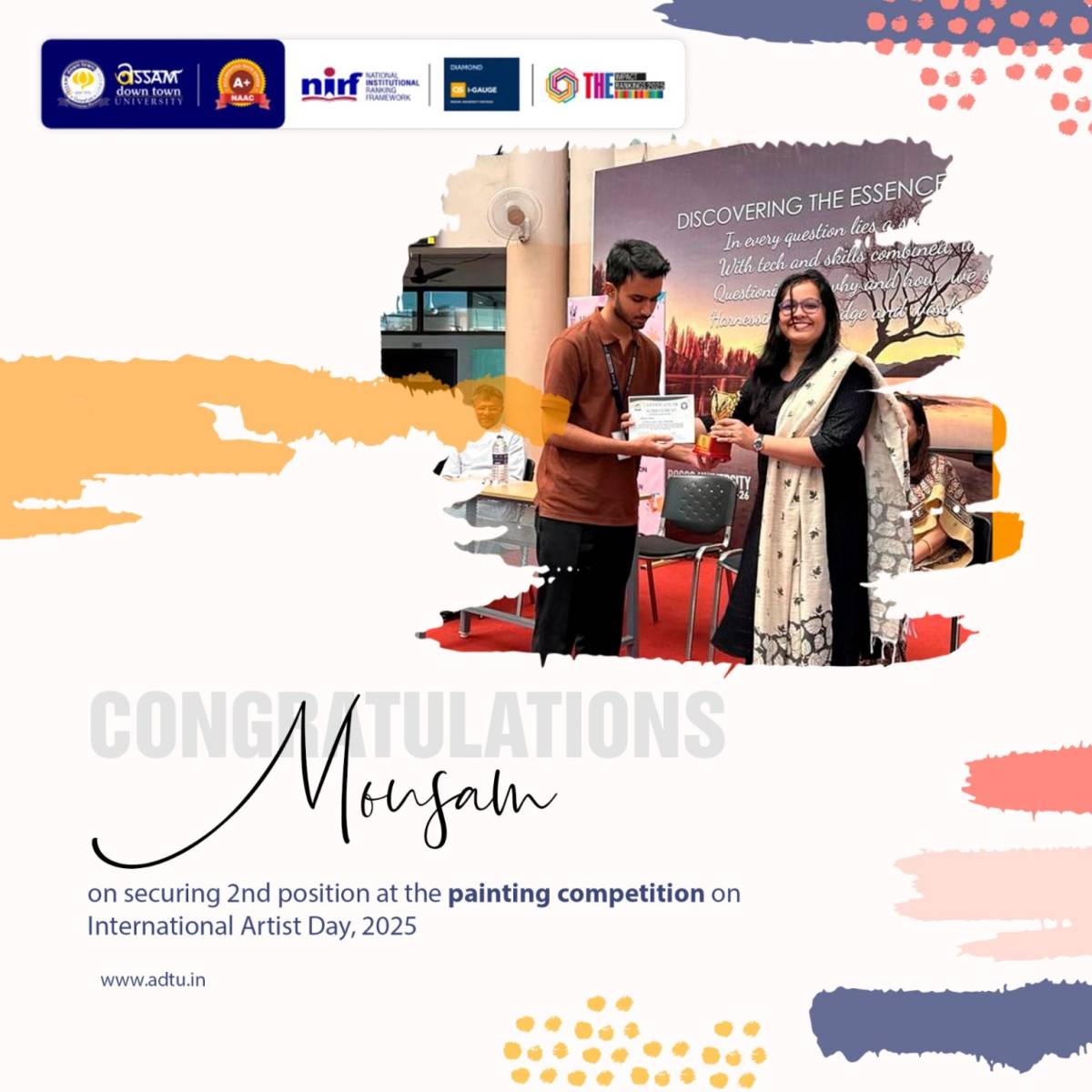 We are delighted to share that Mousam Deka, a student of FoCT, B.Tech CSE (IBM), 1st Semester, has secured Second Place in the International Artist Day Competition held at Assam Don Bosco University, in collaboration with Assam down town University, on the occasion of International Artist Day celebrated on 25th October 2025. Congratulations to Mousam for this remarkable achievement and for bringing pride and recognition to the AdtU Fraternity!