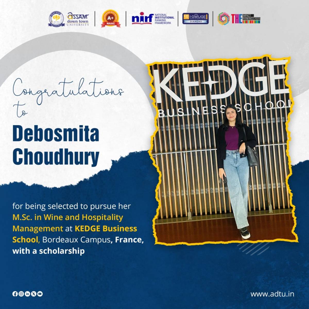 Assam down town University takes pride in congratulating Debosmita Choudhury, alumna of B.Sc. Biotechnology, for being selected to pursue her M.Sc. in Wine and Hospitality Management (2025–2027) at KEDGE Business School, Bordeaux Campus, France with a scholarship.