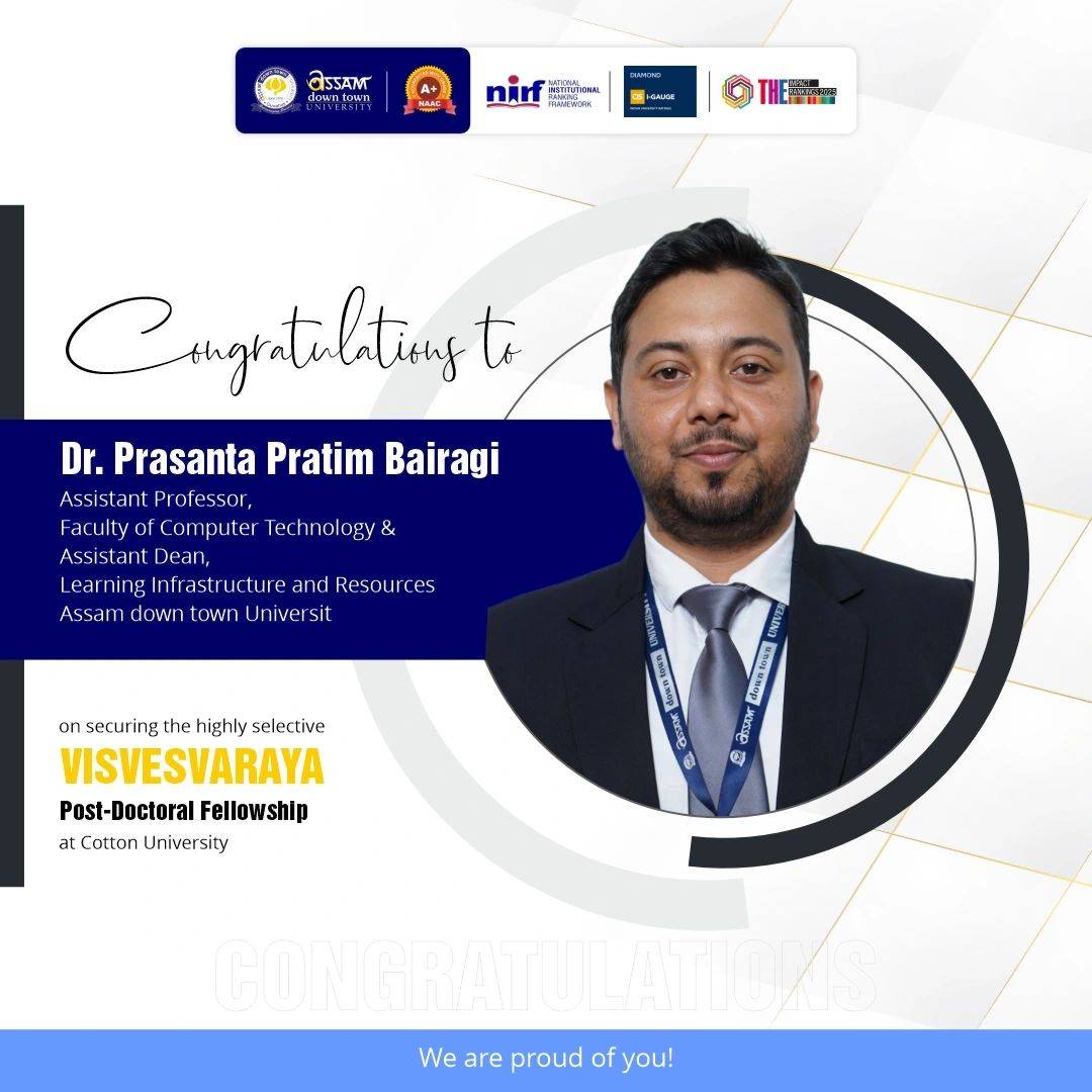 Assam down town University (AdtU) proudly congratulates Dr. Prasanta Pratim Bairagi on his selection as a Post-Doctoral Fellow under the prestigious Visvesvaraya PhD Scheme Phase-II, funded by the Ministry of Electronics and Information Technology (MeitY), Government of India. He will be pursuing his fellowship at the Department of Computer Science & IT, Cotton University.