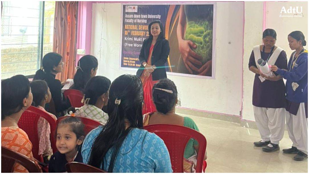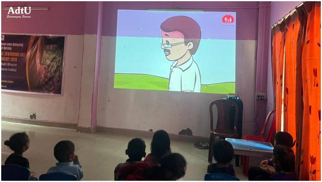 The Faculty of Nursing in collaboration with Sankar Madhab School of Nursing organized National Deworming Day at the Anganwadi Health Centre, Bonda, on 10th February 2026. The programme focused on mass drug administration to eliminate intestinal worms, reduce malnutrition and anemia, enhance school attendance, and promote community awareness regarding hygiene practices, safe drinking water, and proper sanitation to prevent worm infestation.