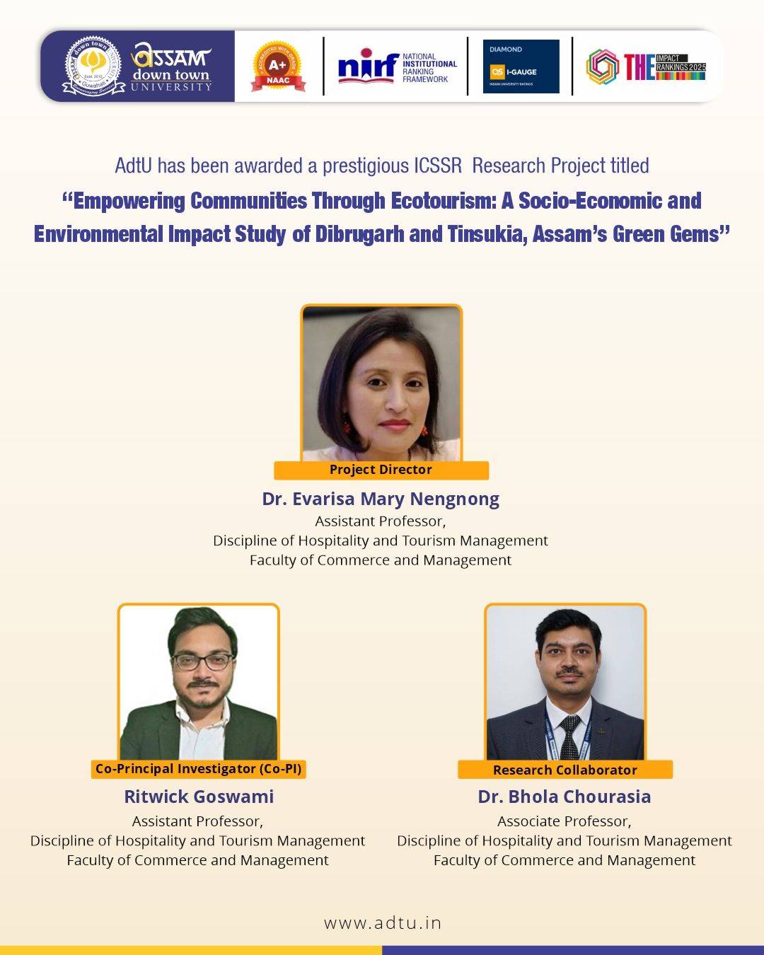 Proud moment for Assam down town University! Assam down town University has been awarded a prestigious ICSSR Research Project on ‘Empowering Communities Through Ecotourism,’ focusing on the socio-economic and environmental impact in Dibrugarh and Tinsukia—Assam’s green gems. This initiative highlights the university’s commitment to sustainable development, community empowerment, and environmental preservation.
