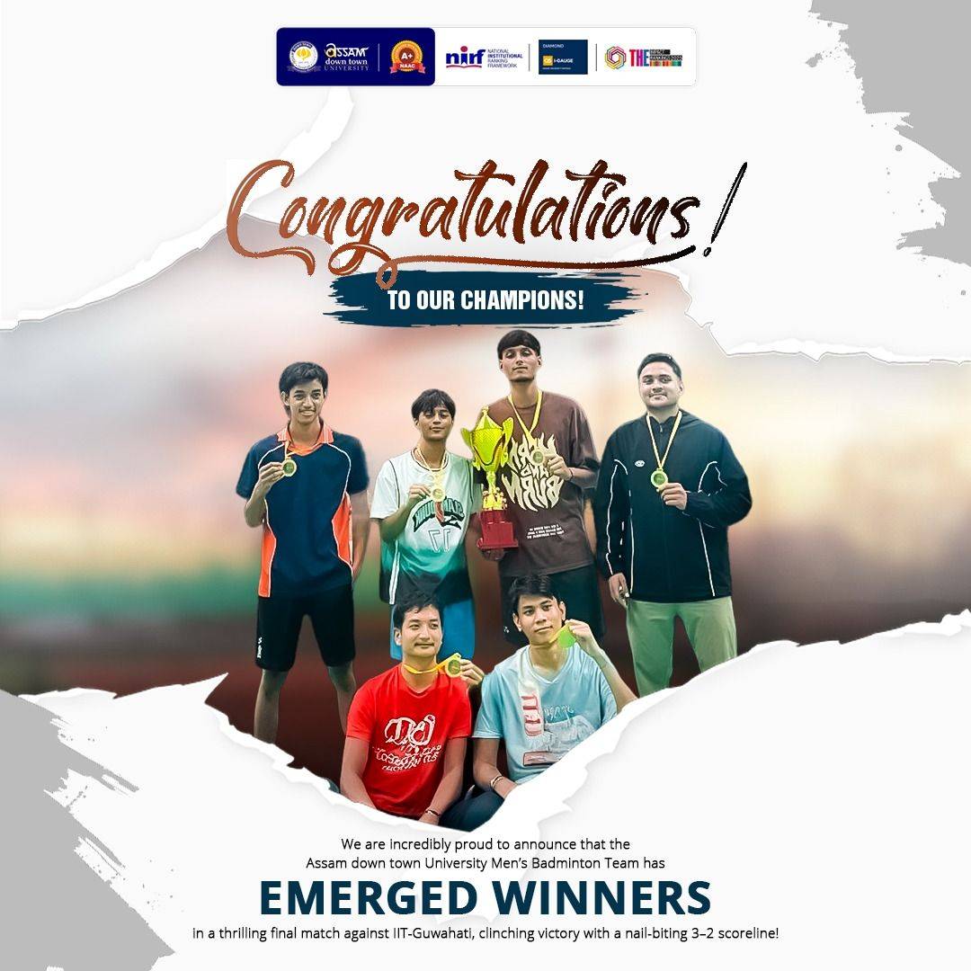 We are incredibly proud to announce that the Assam down town University Men’s Badminton Team has emerged Winners in a thrilling final match against IIT-Guwahati, clinching victory with a nail-biting 3–2 scoreline!