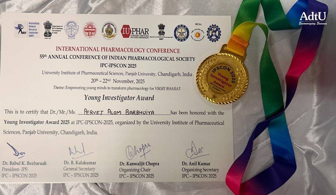 Assam down town University proudly highlights the achievement of Mr. Pervej Alom B. at IPC-IPSCON 2025, where he earned special recognition for his exceptional research presentation. His impactful work, part of his ongoing ICMR-sanctioned project, stood out on the national stage, bringing honour and pride to the entire AdtU community.