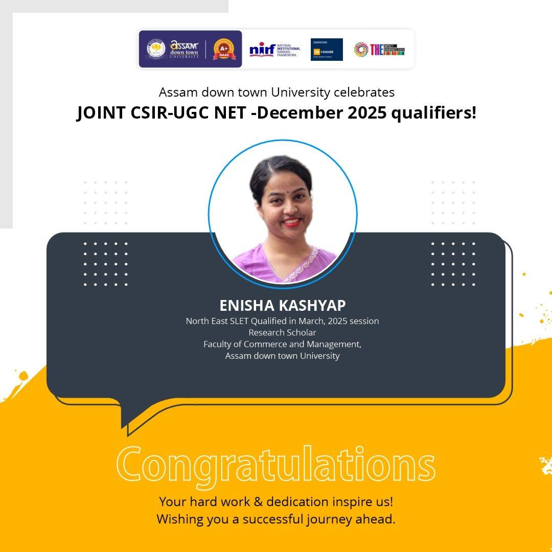 Assam down town University proudly celebrates the success of Enisha Kashyap for qualifying the CSIR-UGC NET (December 2025 session)